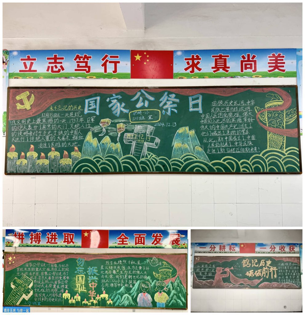 ~ 同时,校园内的黑板报也焕然一新,成为了此次国家公祭日主题教育的重要阵地。各班精心设计的黑板报以“勿忘国耻,振兴中华”“铭记历史,砥砺前行”等为主题,用生动的文字、形象的绘画,传递着对死难同胞的哀思以及对和平的珍视。