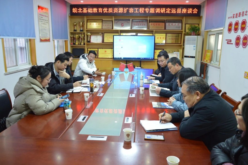 ~ 在随后的座谈会上,县教体局党支部书记张传志对调研组一行的到来表示欢迎。校区校长王坤就帮扶团队生活安置情况、与当地教育环境的融合程度、政府层面的支持保障措施等方面作了具体汇报并提出一些建议。校党支部书记杨孝前详细介绍自皖北地区基础教育优质资源扩容工程实施以来,定远校区在教学教研、德育建设等方面的工作取得积极成果以及急需解决的问题和困难。县教育工委书记张传志表示县教体局高度重视皖北基础教育优质资源扩容工程并对保障工作以及经费和使用情况进行了说明。调研组宋超强调了本次调研的意义和目的,认真听取了汇报和建议,对定远分校现阶段的工作给予了肯定,对帮扶团队表示了诚挚的感谢。