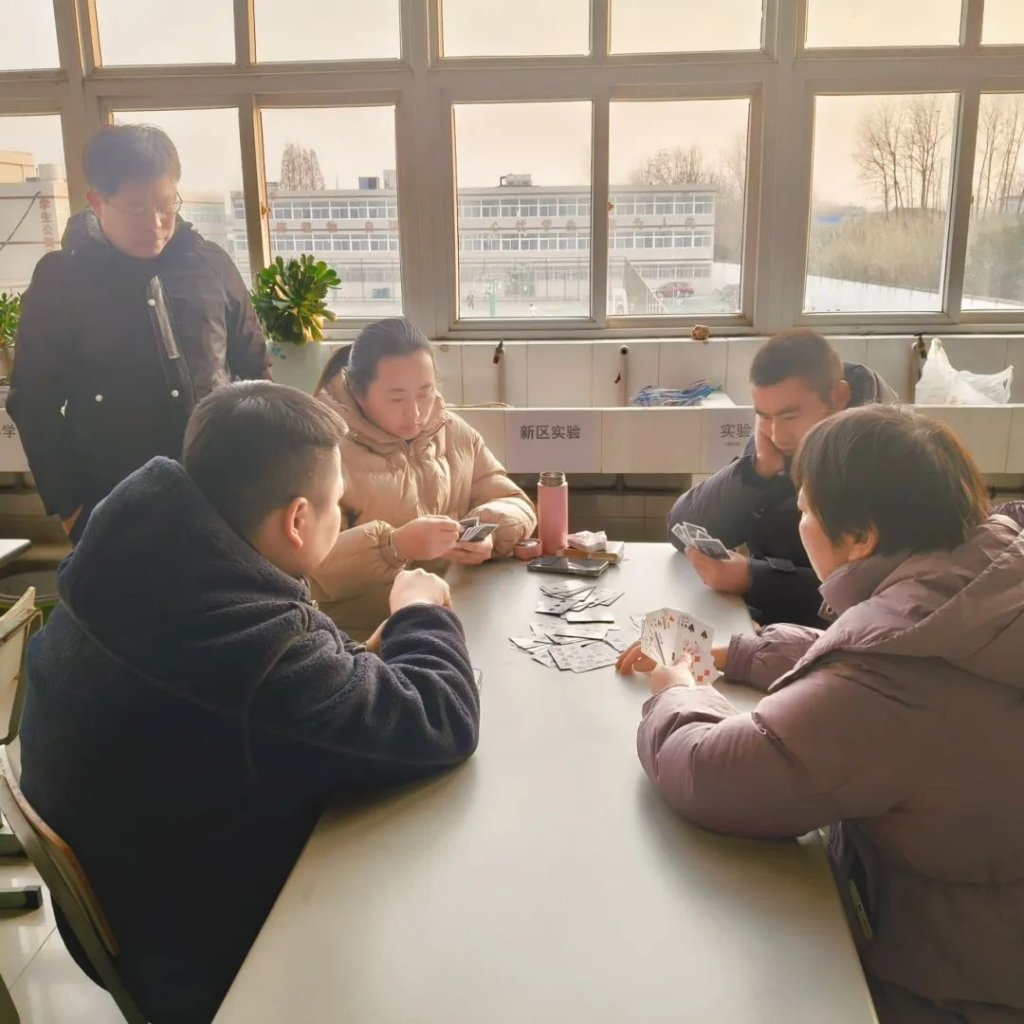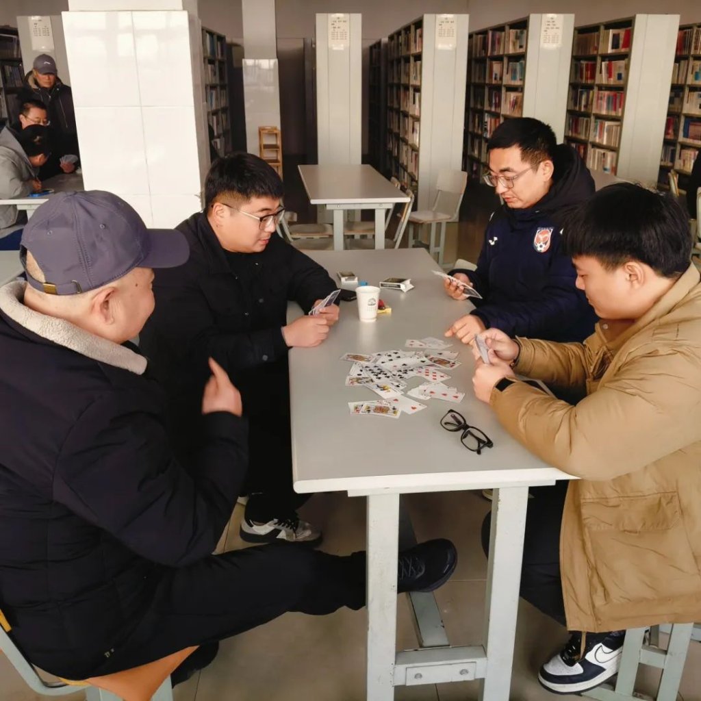 ~ 本次比赛共有40名教职工通过部门选拔报名参赛。20日下午16:00,40名选手兴味盎然地齐聚校图书阅览室,按照现场随机抽签组成桌次,采用积分制层层淘汰。选手们在比赛中与队友默契配合,沉着应对,在欢声笑语中与对手斗智斗勇,比拼牌技和牌运。
