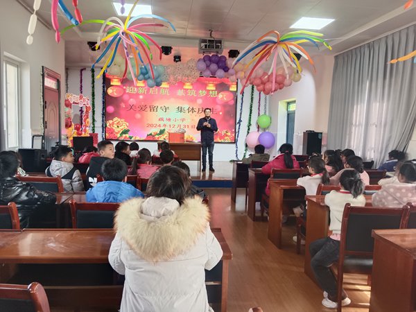 在2025年新年钟声即将敲响之际,定远县藕塘小学于2024年12月31日成功举办了一场以“迎新启航、共筑梦想”为主题的关爱留守儿童“迎新年、庆生日”暨心理健康课活动。本次活动旨在营造浓厚的新年节日氛围,让留守学生感受到来自社会、学校和老师的深切关怀,以及家庭般的温暖和爱。