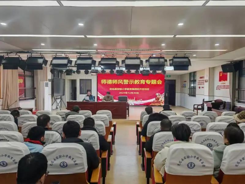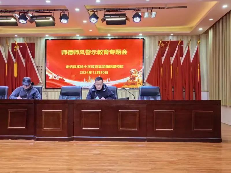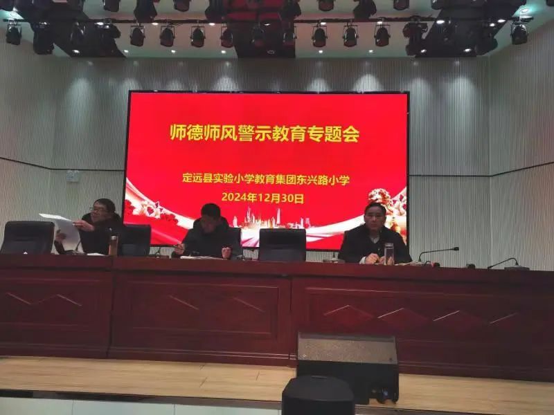 ~ 12月30日下午,定远县实验小学教育集团《师德师风警示教育专题会》在三个校区,三个附属幼儿园中同步召开。会议深度聚焦师德师风建设工作,以警示教育为重点,再念遵守新时代教师职业行为“紧箍咒”,大力弘扬教育家精神。370余名教师在所属校区、幼儿园分会场参加会议。校党总支书记陈恩源、副书记姚明峰出席东兴路校区会议,并向广大教师提出要求。校党总支副书记、校长武文松出席经开区校区会议。