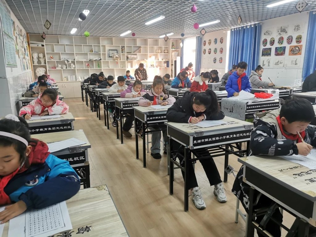 ~ 书法赛场,同学们坐姿端正,握笔规范,神情专注,笔尖在书写纸上舞动,撇捺伸展,留下一个个汉字精灵。