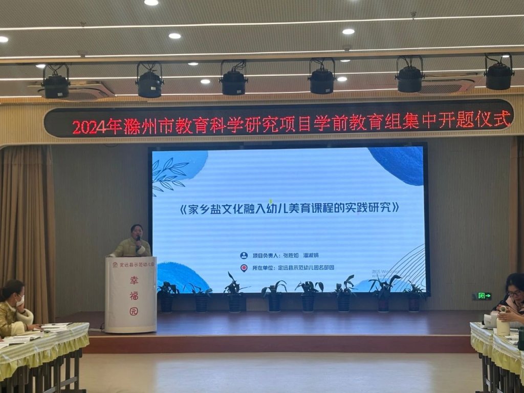~ 定远县示范幼儿园名邸园市级研究课题《家乡盐文化融入幼儿美育课程的实践研究》近日开题。 课题总负责人张胜如老师陈述开题报告,从国内外研究现状、研究价值、研究过程与方法、预期创新之处、预期研究成果及形式、组织结构及成员分工等方面做了详细而全面的阐述。