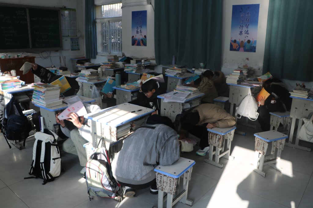 ~ 演练开始前班主任及相关人员迅速到位。随着警报声响起,演练正式开始,所有学生迅速反应,保护好头部藏身课桌下。警报声解除后,各班学生进行迅速有序撤离到教学楼前安全地带蹲下。