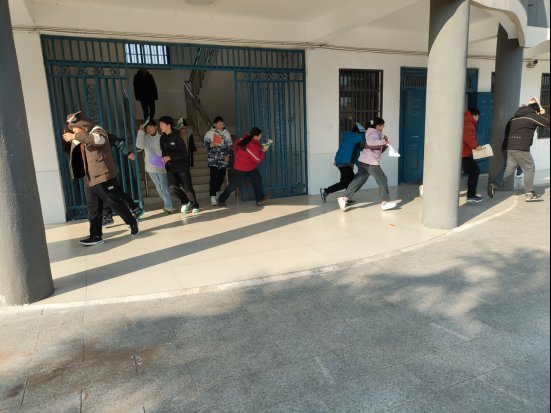 ~ 下午14:25分,演练警报响起,全体师生快速进入避险状态。各楼层的疏散人员和班主任迅速到位,各上课老师组织学生以最快速度躲避到课桌下或课桌旁,蜷曲身体,降低身体重心,防止地震带来的伤害。