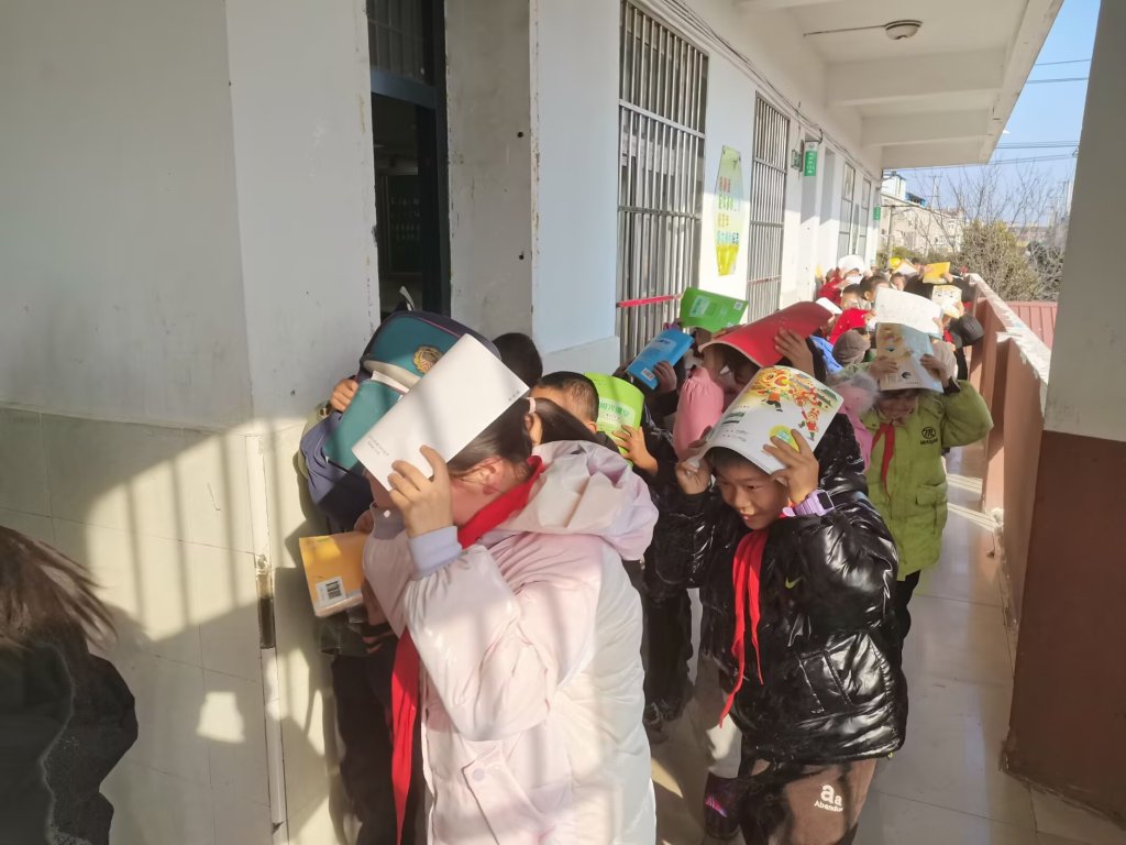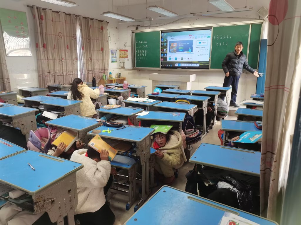 ~ 随着警报声响起,演练正式开始。正在上课的教师们迅速反应,立即指挥学生们双手抱头,就近躲在课桌下进行紧急避险。待“主震”结束,第二次警报响起,老师们组织学生按照预定的疏散路线,迅速、有序地撤离教室。