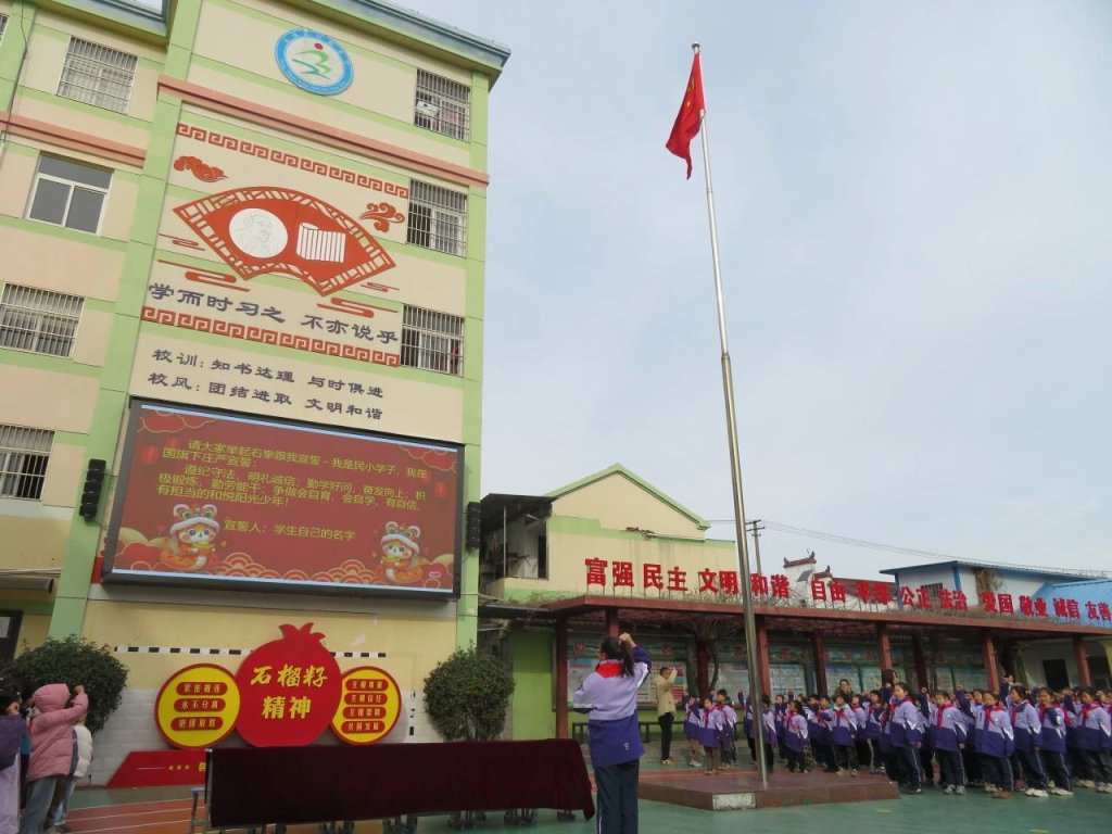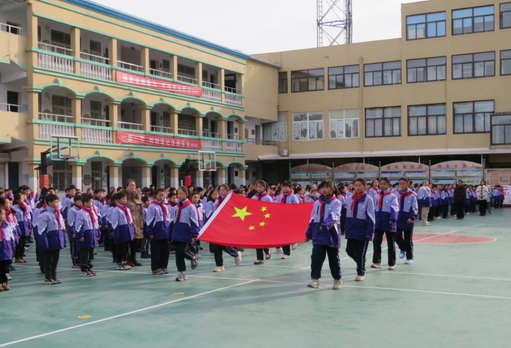 ~ 开学典礼在庄严的升旗仪式中正式开始,鲜艳的五星红旗缓缓升起,全体师生庄严肃立,向国旗行注目礼,激昂的国歌声回荡在校园上空。
