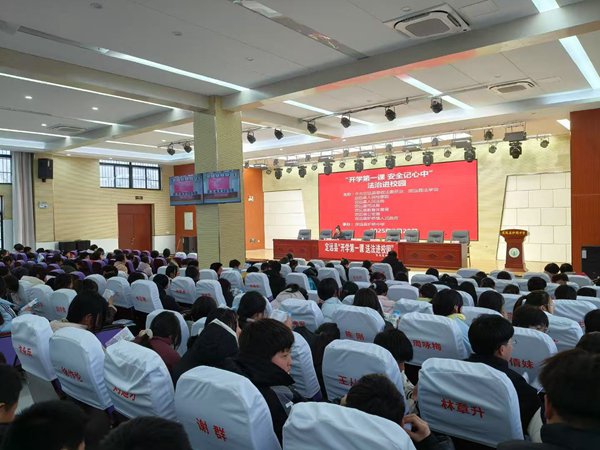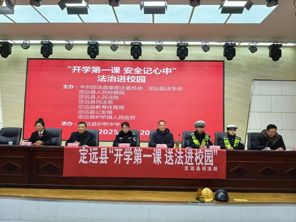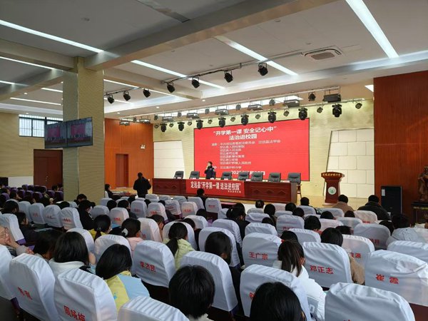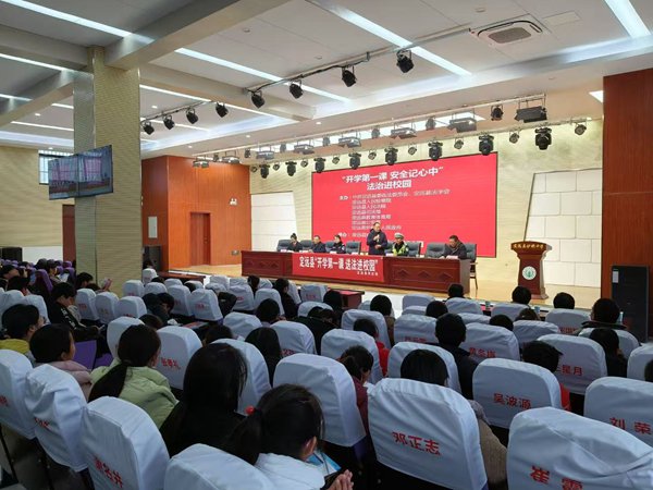 ~ 为进一步加强学生的交通安全、夏季防溺水、安全救护、未成年人保护法等宣传教育,构建平安健康校园,2月20日下午,中共定远县委政法委员会、定远县人民法院、定远县检察院、定远县司法局、定远县教育体育局、定远县公安局、定远县炉桥镇人民政府干部走进定远县炉桥中学开展“开学第一课 安全记心中”法治安全专题宣传活动,学校领导、安全办及七年级全体学生参加了此次活动。活动由学校党委书记柏传文主持。