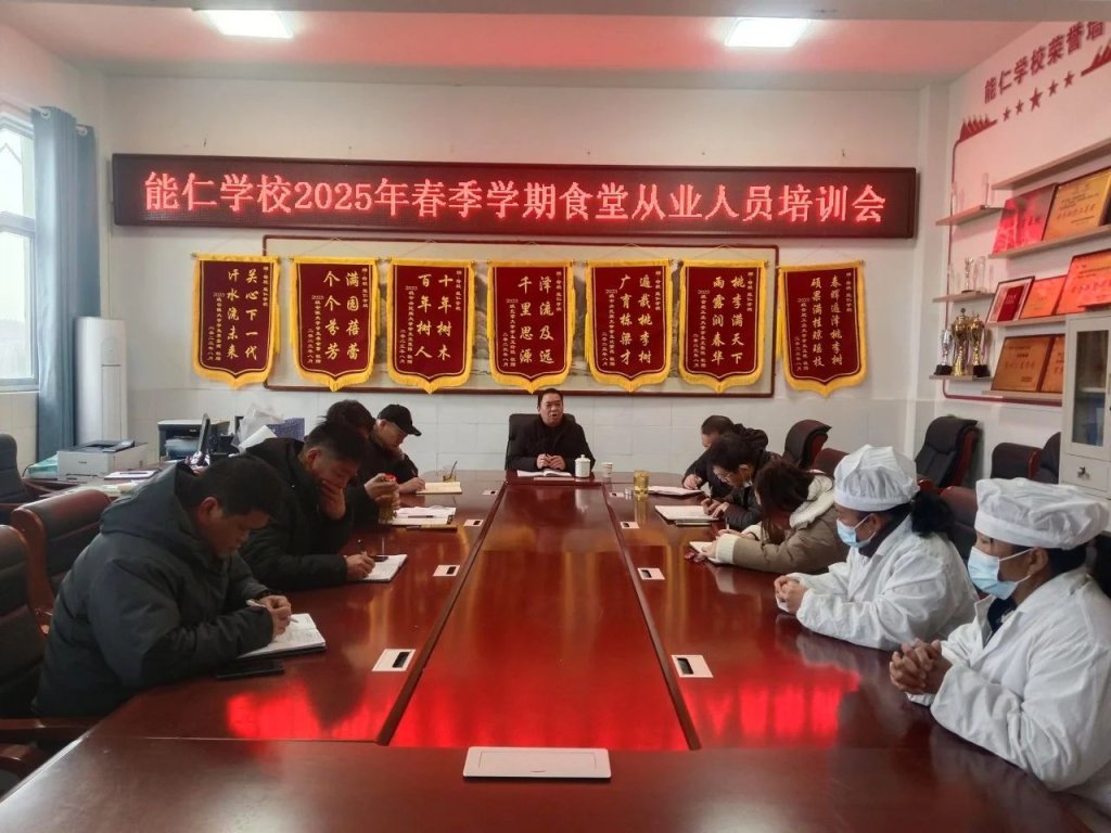 ~ 2月17日上午,定远县能仁学校召开2025年春季学期食堂从业人员培训会,校长室成员、食堂负责人、食堂从业人员参会。