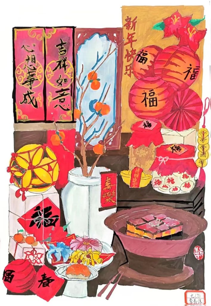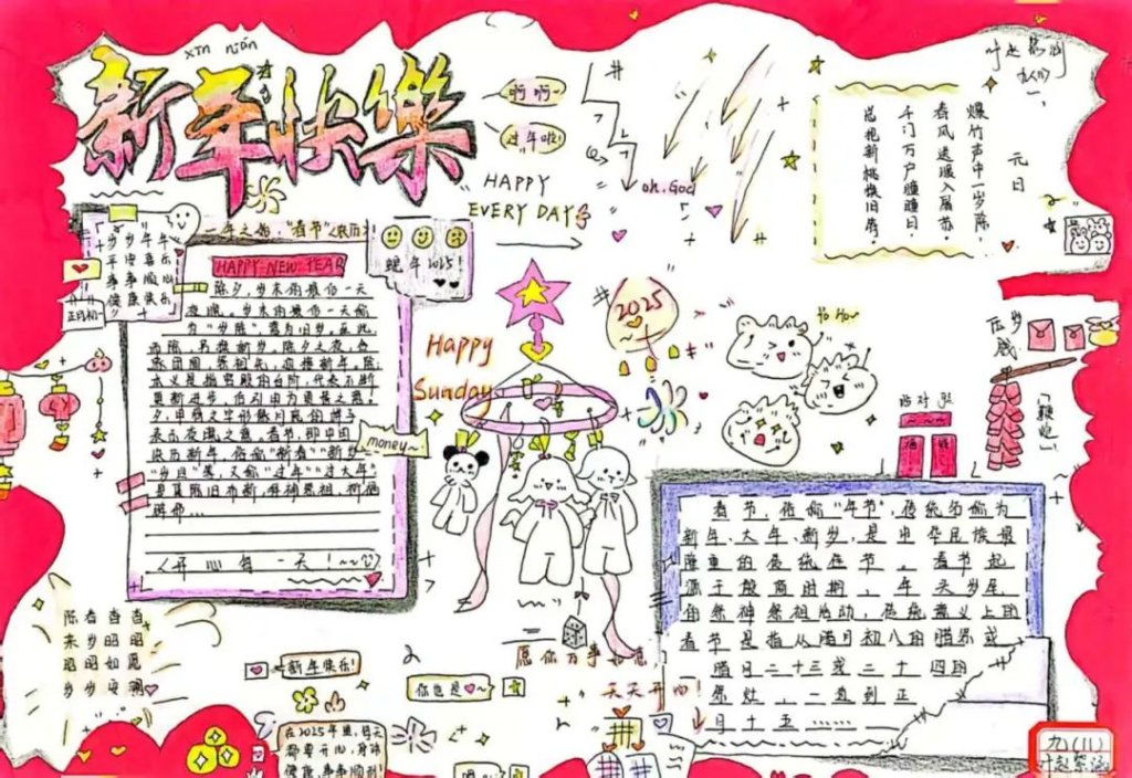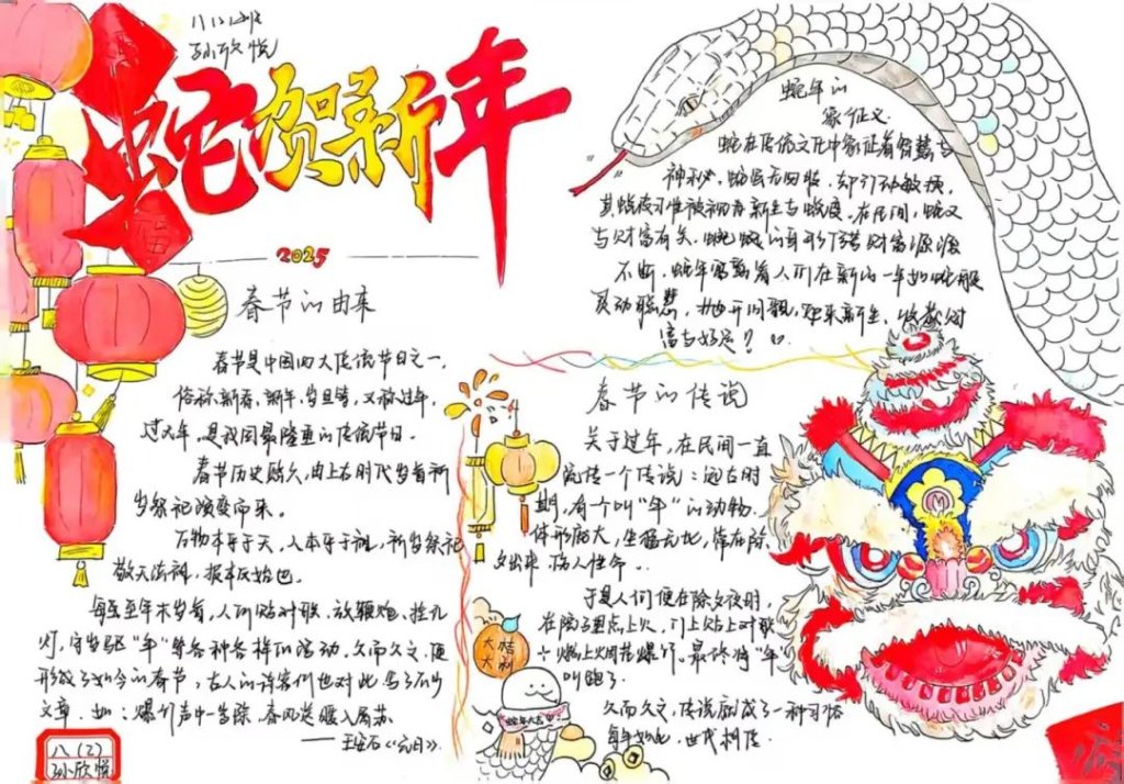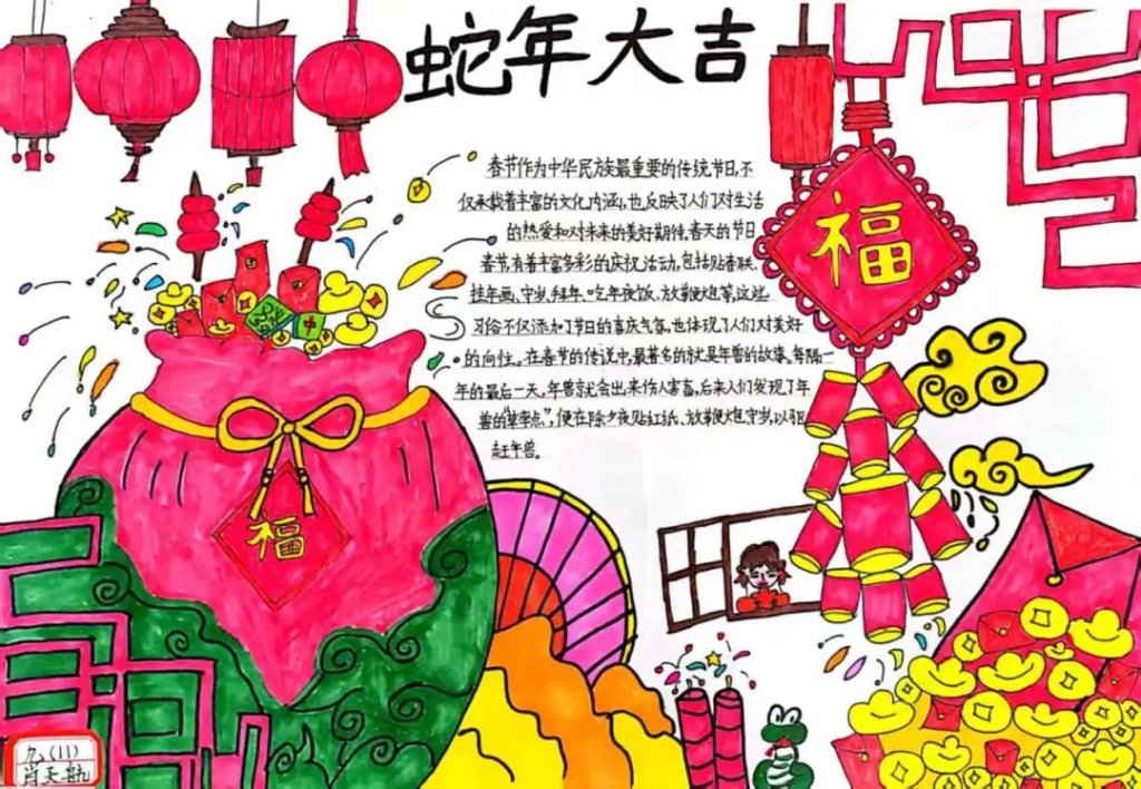 ~ 同学们围绕春节的起源、习俗、美食等内容,制作出一张张精美的手抄报,用画笔描绘出他们心中的春节。