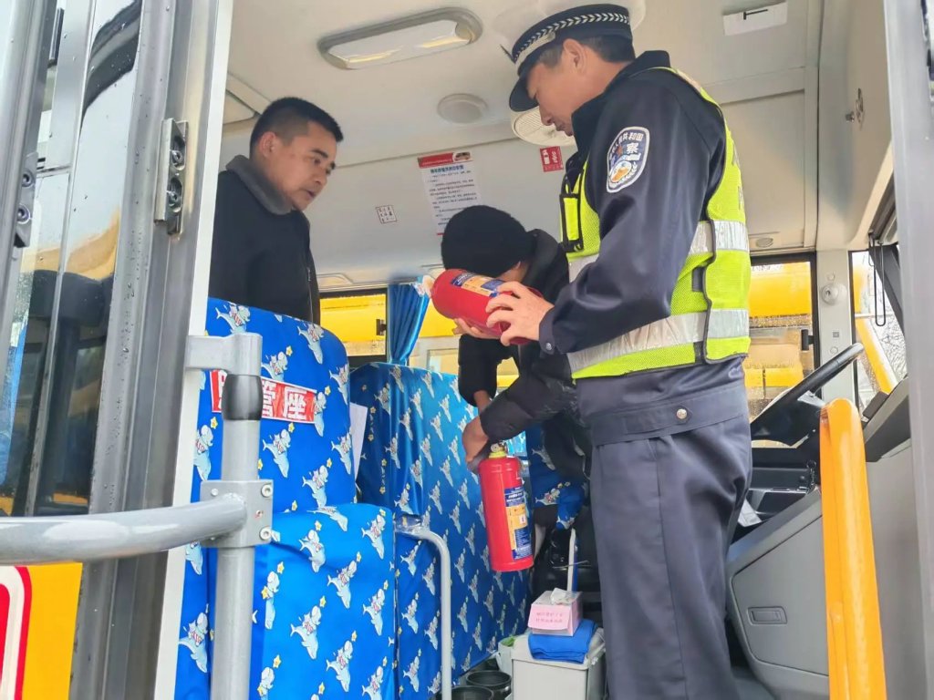 ~ 为确保驾驶员熟练掌握车辆应急处置技能,交警现场对校车的安全设施设备进行检查,并对照操作规程,手把手指导驾驶员如何正确使用灭火器、安全锤等应急工具,以及在遇到突发情况时如何迅速、有效地疏散学生。