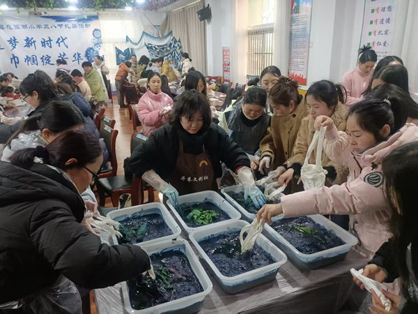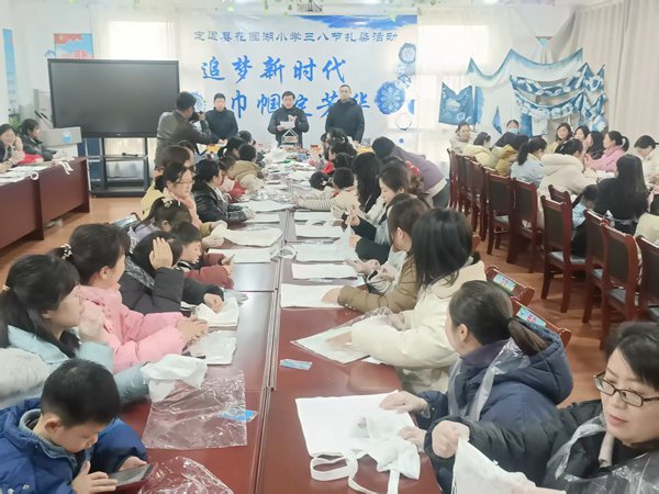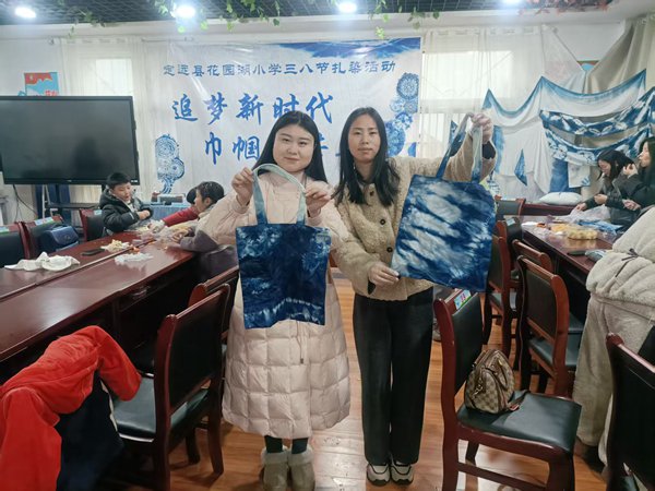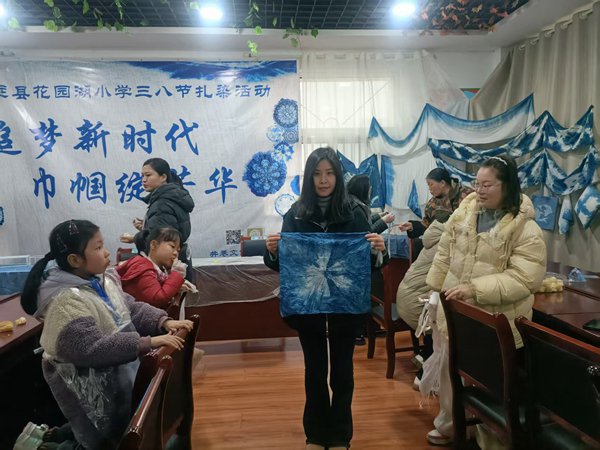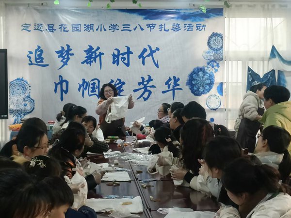 ~ 为迎接第115个国际劳动妇女节,弘扬中华传统非遗文化,丰富女教职工精神文化生活,3月7日下午,定远县花园湖小学工会精心组织全体女教师开展“追梦新时代 巾帼绽芳华”主题扎染体验活动。