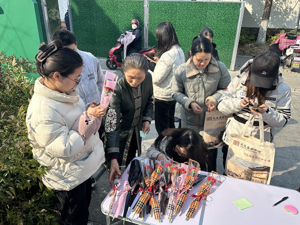 ~ 此次活动不仅为女读者提供一次表达心声的机会,更通过赠送鲜花的方式,传递了对女性的温暖与关怀。活动现场精心布置了留言打卡区域,摆放着精美的展板和便利贴等留言工具,营造出温馨而富有节日氛围的环境。女读者们热情高涨,她们在留言板上写下自己对妇女节的感悟、对未来生活的美好期许。一位女士在留言时表示:“这个活动非常有意义,让我有机会表达自己对妇女节的理解,同时还能收到这么美丽的康乃馨,感觉非常幸福。”另一位女士则分享道:“留言打卡让我感受到了与其他女性的共鸣,我们共同庆祝这个属于我们的节日。而在图书馆里过这个节日更有意义,书香伴花香,让我感觉很满足。”