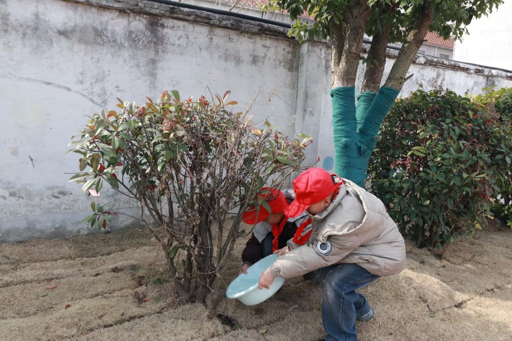 ~ 活动中,他们头戴小红帽,手持工具,为校园的树木进行浇水,每一棵树都认真对待,一丝不苟。经过一上午的辛勤劳动,校园的树木都喝上了今春的第一口“甘泉”。同时,他们还将校园内绿化带、主路边的白色垃圾清理干净。