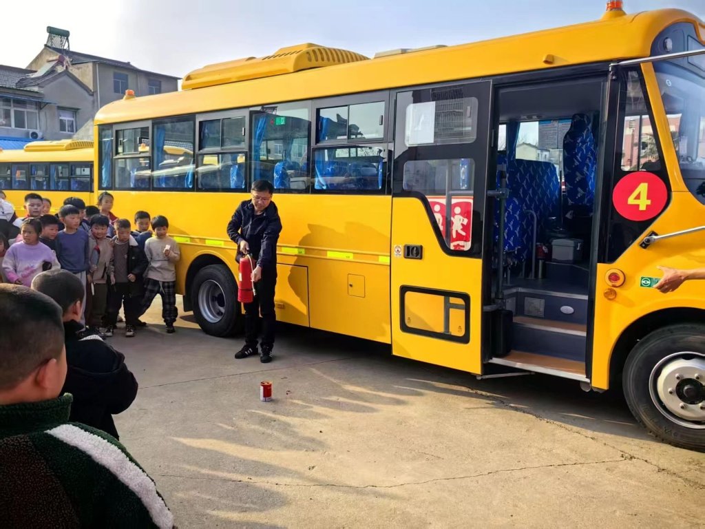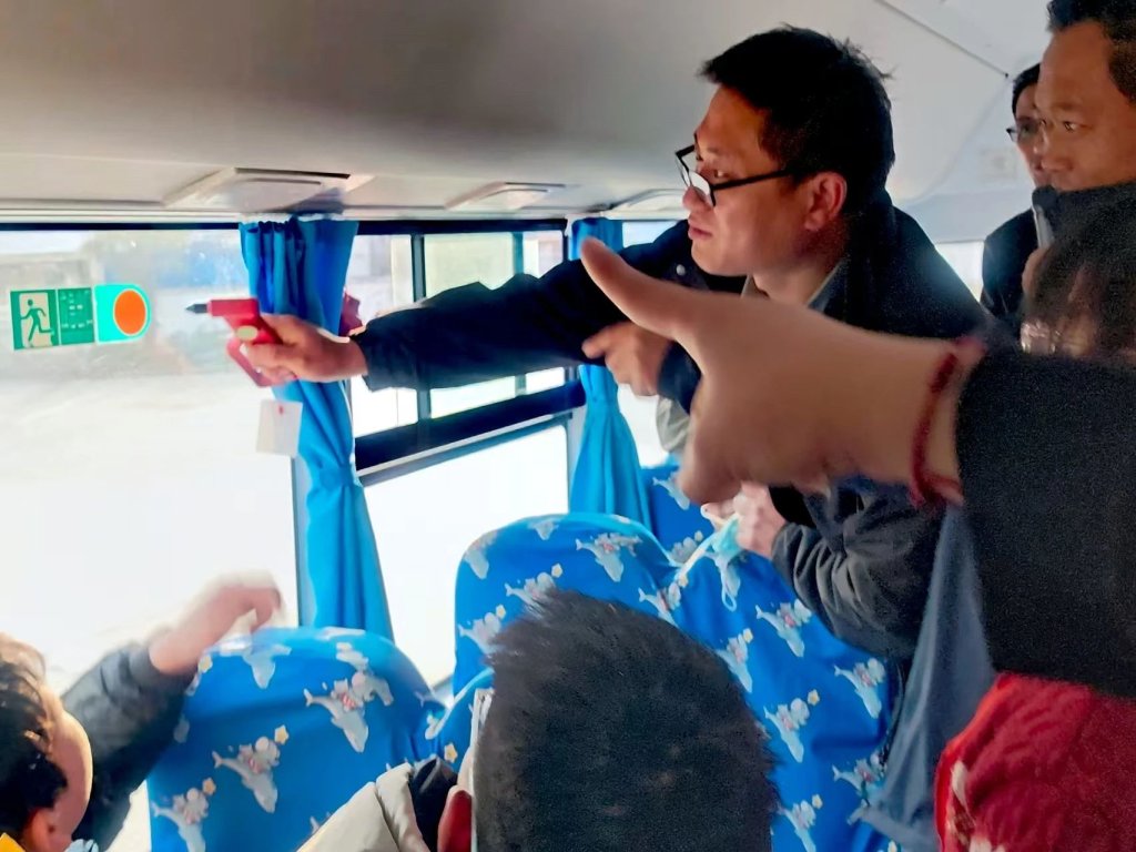 ~ 此次演练通过情景模拟+实操教学的方式,为两百余名师生及校车工作人员上了一堂生动的安全教育课。演练现场,模拟校车在行驶途中突发电路故障引发火情。驾驶员师傅临危不乱,第一时间完成标准应急操作:拉手刹、开车门、启动双闪警示系统,与随车照管员默契配合,组织车上”被困”学生实施科学逃生。”低头弯腰,捂住口鼻!””不要推挤,顺次撤离!”在工作人员的引导下,学生们快速通过前门和应急逃生门完成疏散,在安全区域迅速完成人数清点。与此同时,随车人员使用车载灭火器对初期火源进行扑灭,并同步完成119报警、120求助及校方通报流程。”这个安全锤要敲击车窗四角,钢化玻璃会呈蛛网状碎裂。”