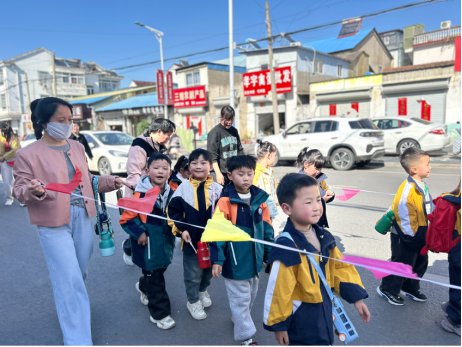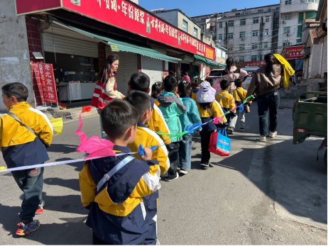 ~ 活动前一周,老师们便以”超市探秘”为主题开展系列准备,教师团队提前踩点,规划安全步行路线,沿途设置”交通信号灯体验点””便利店观察站”等趣味学习节点。徒步出发的过程中,城市中的自然课堂吸引着孩子们。”看!树叶像小船飘下来!””快递叔叔的电瓶车要停在白线里哦!”孩子们化身”小小观察员”,用童言童语记录所见所感。途中,教师巧妙融入随机教育, 在十字路口化身”交通指挥官”,用红绿灯儿歌巩固安全知识。
