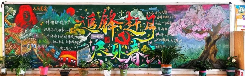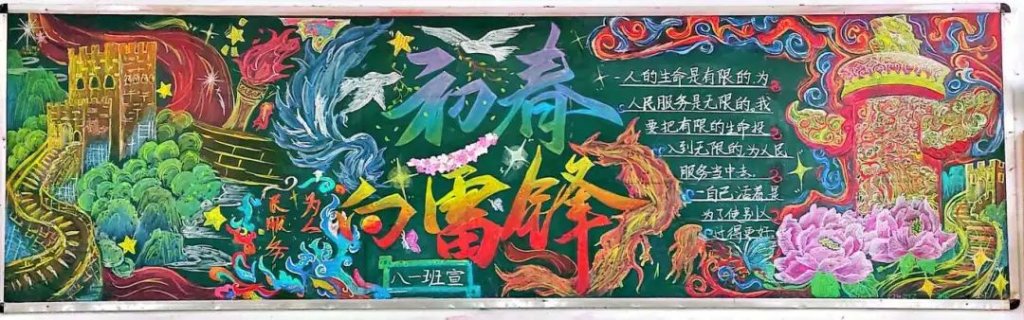 ~ 主题黑板报成为宣传雷锋精神的亮丽窗口,五彩粉笔绘就雷锋形象,书写感人故事与励志话语,一笔一划满含敬仰,雷锋精神在校园随处可见。