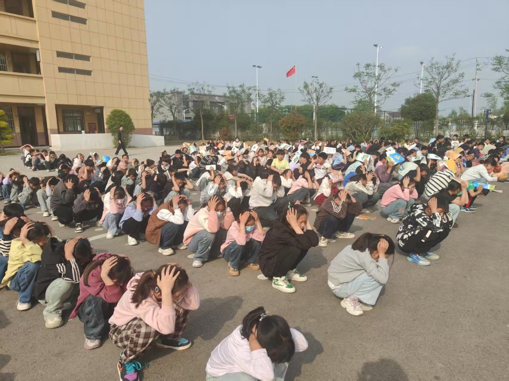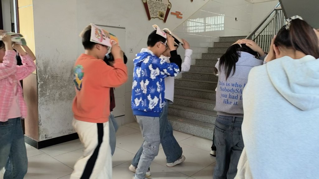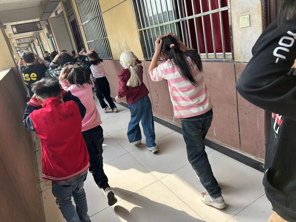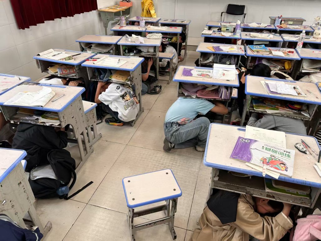 ~ 随着急促的警报声在校园内骤然响起,防震演练正式拉开帷幕。正在教室上课的学生们迅速做出反应,在老师的指挥下,迅速躲到课桌下,双手紧紧护住头部,尽量蜷曲身体,降低身体重心。当第一波“地震”波过去,第二次警报声响起,老师们立即组织学生们按照预定的疏散路线有序撤离。同学们猫着腰,用书本或手臂护住头部,沿着楼梯两侧快速而安静地向操场撤离。整个过程中,老师们时刻关注着学生的安全,不断提醒学生们不要惊慌,保持秩序。