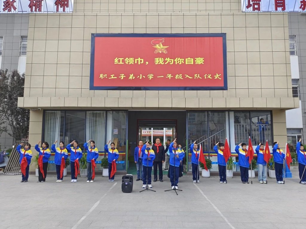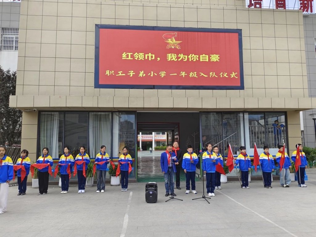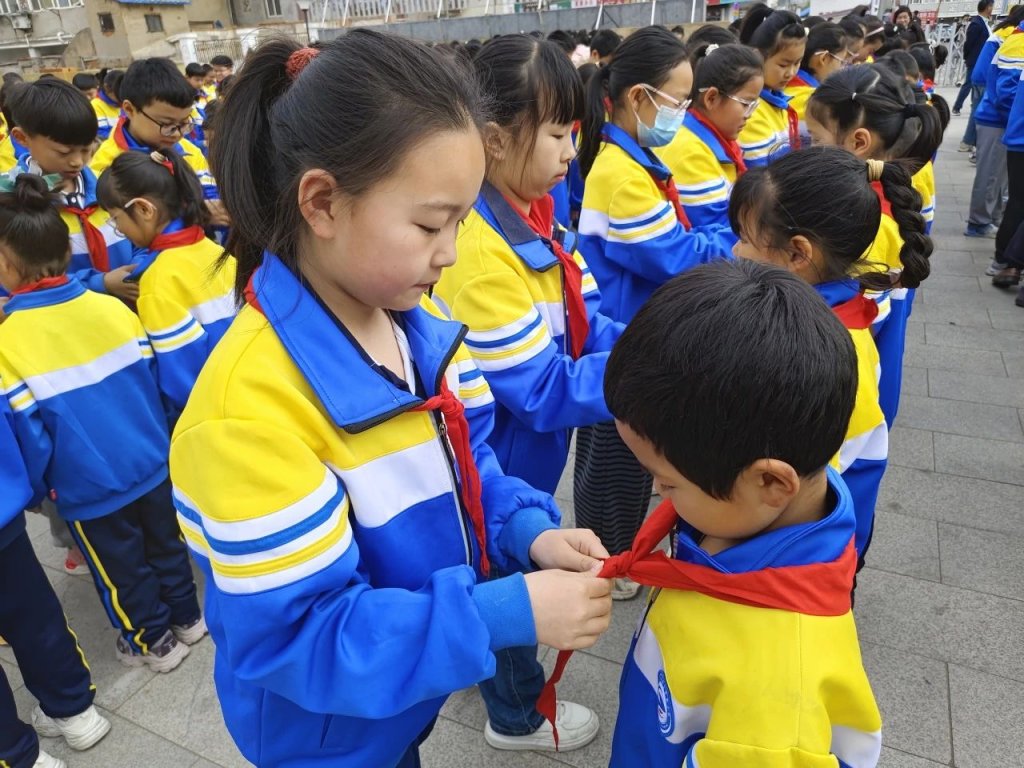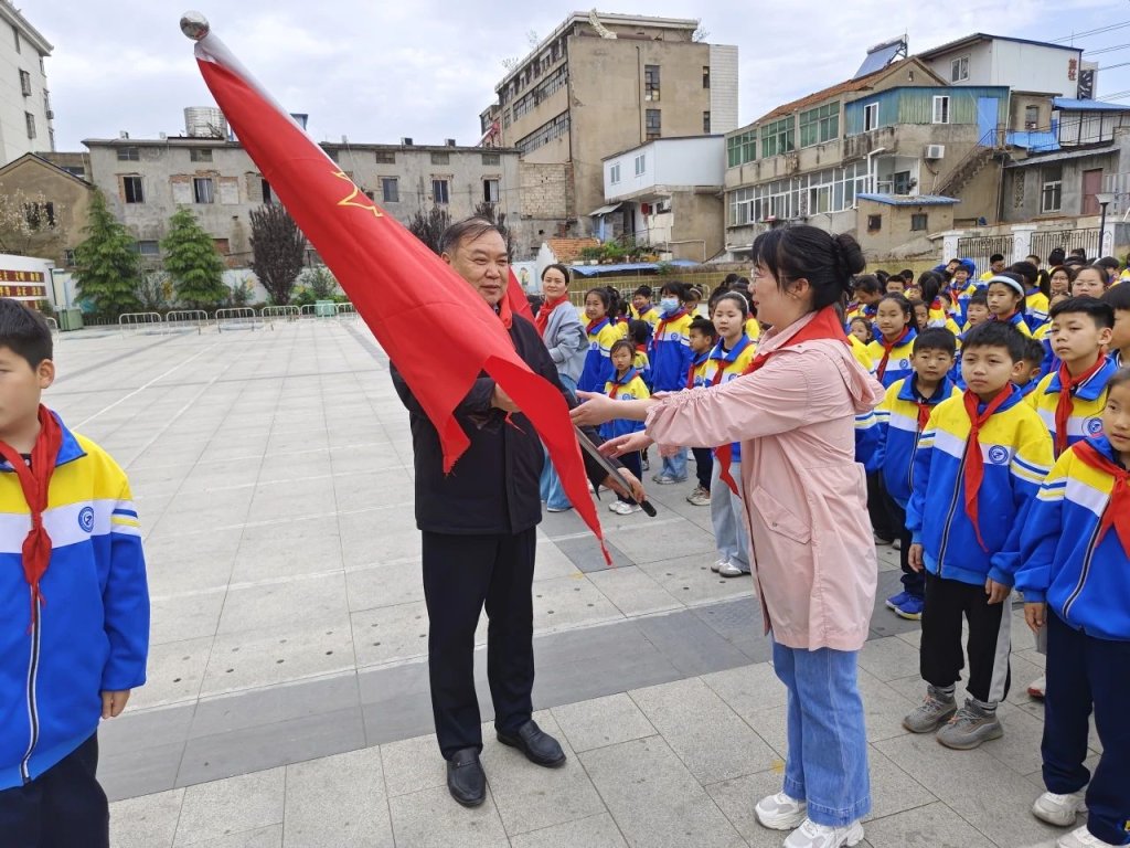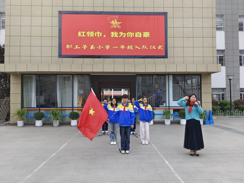~ 入队仪式在主持人清脆响亮的宣布声中拉开帷幕。护旗手迈着整齐有力的步伐护送队旗入场,全体少先队员庄严地敬队礼,目光紧紧追随着队旗,现场气氛庄重肃穆。随后,激昂的《中国少年先锋队队歌》响起,同学们齐声高歌,用嘹亮的歌声表达着对少先队组织的热爱和向往。 党支部副书记邓先弟宣读了组建年级少先队组织的决定,接着宣布了新队员名单。在欢快的音乐声中,老队员们将象征光荣与责任的红领巾系在新生颈间。新队员们稚嫩的脸上洋溢着自豪与喜悦,他们高高举起右手,向老队员回敬队礼,这一戴一回之间,传递着少先队的精神与使命。