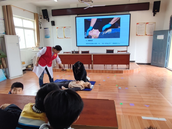 ~ 心血管内科李银医生通过案例分享强调了急救“黄金4分钟”的重要性,并借助人体模型现场演示了心肺复苏(CPR)和海姆立克急救法的操作流程。在分步讲解中,李银特别指出常见操作误区:“按压时手臂要伸直,用上半身力量垂直下压,频率需保持在每分钟100-120次。”李医生还组织学生进行了模拟演练。八(1)班王雪涵同学在实操后表示:“虽然手臂很酸,但学会了救命技能,特别有意义!”