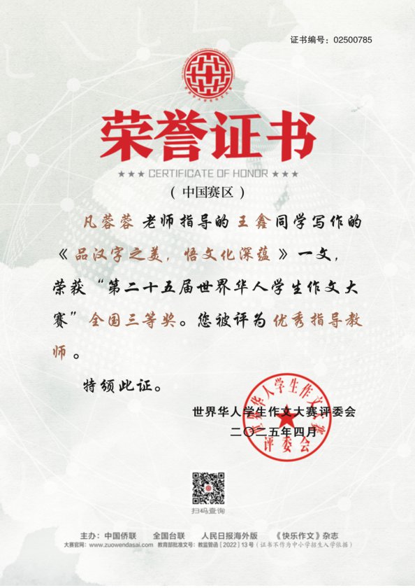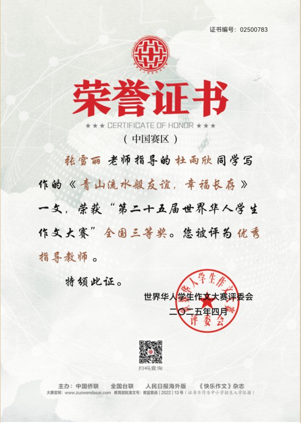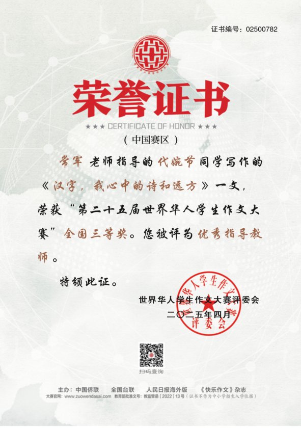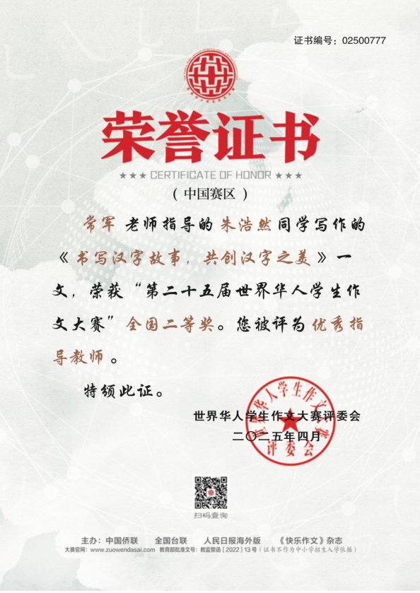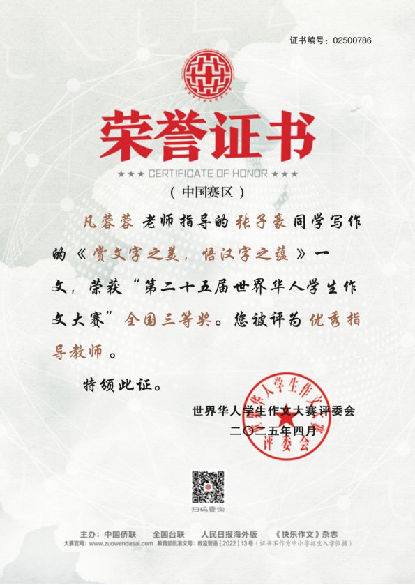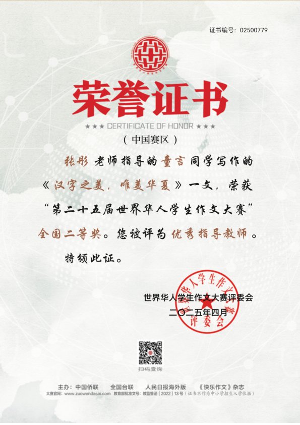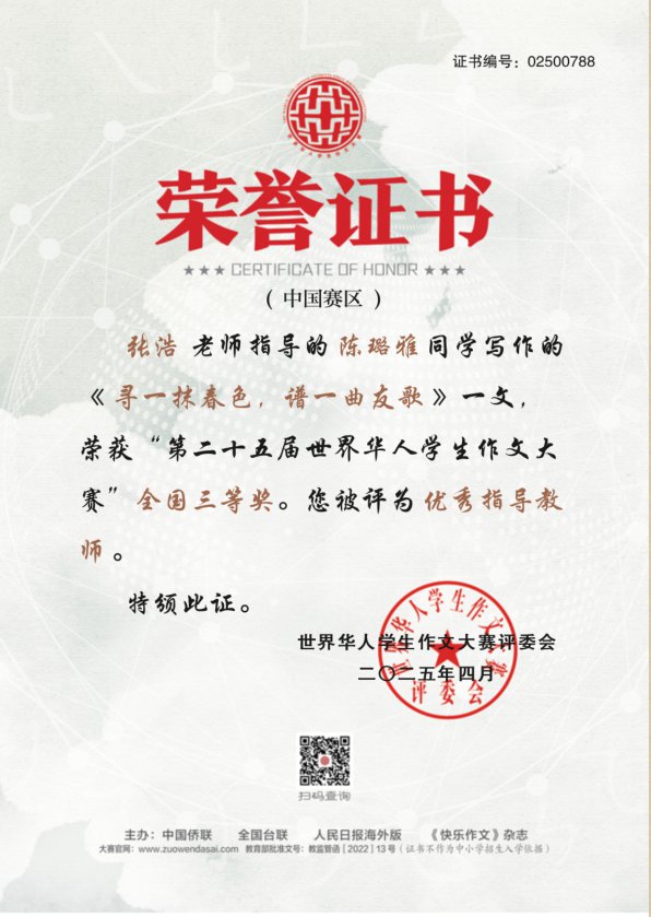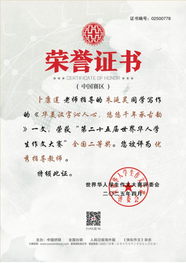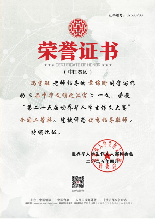 ~ 近日,由中国侨联、全国台联、人民日报海外版、《快乐作文》杂志共同主办的“第二十五届世界华人学生作文大赛”结果已揭晓,滁州市定远英华中学学子凭借扎实的文学功底和不懈的努力,喜获佳绩!其中二等奖4人,三等奖8人。8位老师获得“优秀指导教师”荣誉。