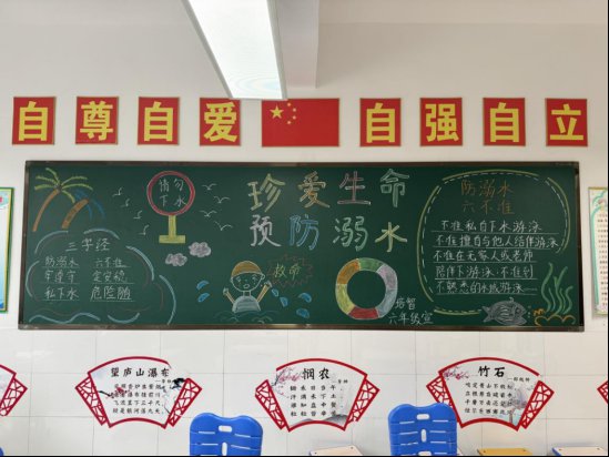 ~ 各班级设计了图文并茂的防溺水黑板、发放防溺水致家长一封信和召开了防溺水主题班会。向学生及家长们宣传防溺水的相关知识,利用观看多媒体视频案例让学生及家长们更加直观地了解到溺水事故的惨痛教训,增强防范意识。