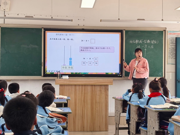~ 课堂上,戚怀景老师带来的是数学课程《两位数减一位数》。戚老师以一段充满趣味的动画视频作为导入,瞬间抓住了学生们的眼球,成功激发了大家的学习兴趣。在讲解过程中,老师巧妙地运用生活实例,将复杂的知识点变得通俗易懂。比如在讲解减法的退位时,老师结合同学们日常购买文具的经历,让大家轻松理解了核心知识点。同学们积极参与课堂互动,纷纷举手发言,分享自己的想法和见解,课堂氛围十分活跃。小组讨论环节更是将课堂推向了高潮,同学们围坐在一起,热烈地讨论着问题,思维的火花不断碰撞,共同探索知识的奥秘。