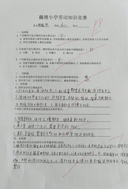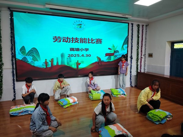为深化劳动教育成效,学校同步开展劳动知识竞赛,并通过电子屏滚动宣传劳动标语,营造“劳动最光荣”的浓厚氛围。此次活动不仅培养了学生的劳动技能,更让他们懂得珍惜劳动成果,树立了“以辛勤劳动为荣”的价值观。藕塘小学将持续推进劳动教育,助力学生全面发展。(图文:赵悦 审核:罗培齐)