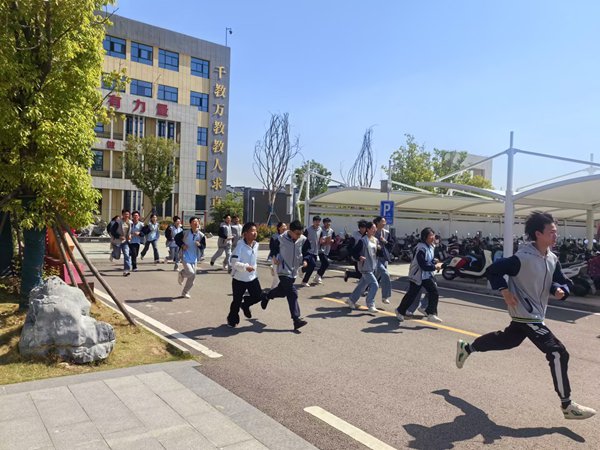 ~ 演练前,校区安全办结合实际情况制定了详细的应急预案,在各楼层、通道指定专人负责引导,确保疏散路线清晰、责任到人。上午9:35,随着急促的警报声响起,演练正式拉开序幕。参与人员迅速反应,在任课教师和班主任的指挥下,就近躲避至课桌下、承重墙角落等安全区域,并用书本、手臂护住头部。一分钟后,“主震”结束,全体人员按预定路线弯腰低姿、有序撤离至操场、空旷安全区域。整个疏散过程仅用时4分钟17秒,无拥挤、踩踏情况,达到预期效果。