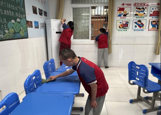 ~ 其四、校园与班级劳动齐参与 学生们分组清理操场、擦拭橱窗,用实际行动维护校园环境。让每位学生都能在力所能及的劳动中获得成就感。