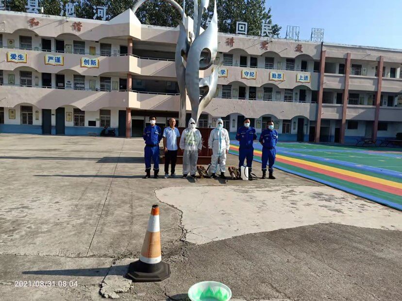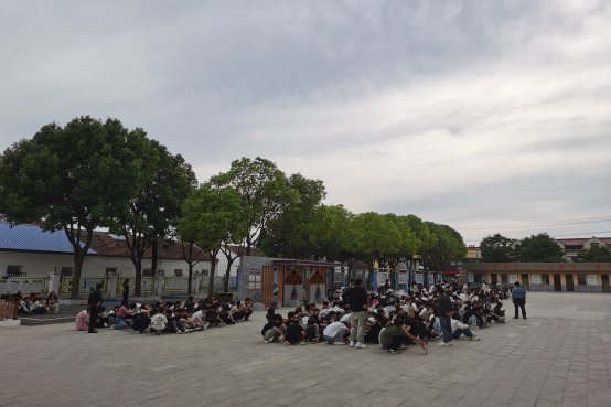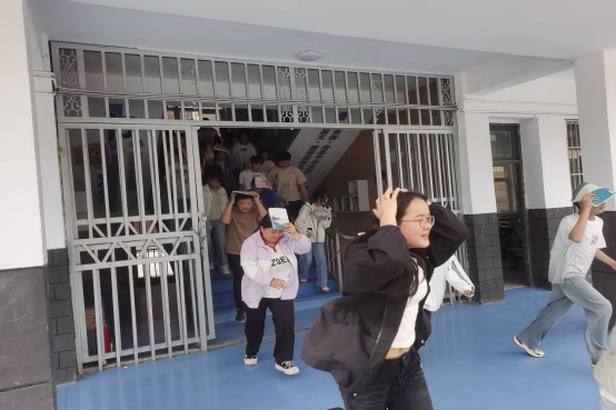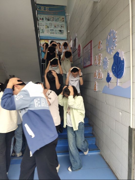 ~ 下午3:40,当警报声第一次响起时,八、九年级在教室上课的学生,用手或书护住头部躲在课桌下面;第二声警报响起时,学生们在老师的指挥下迅速离开座位,按照指定路线有序撤离,所有师生2分钟内均安全疏散到指定区域。