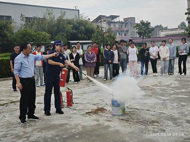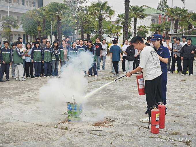 ~ 在灭火器使用教学环节,宣传员以“提、拔、握、压”四字口诀为核心,现场演示干粉灭火器的正确操作流程,并着重强调灭火时的站位、角度及注意事项。为让学生真正掌握技能,消防大队特别设置点火实操区域,在确保安全的前提下,组织学生轮流上手体验。学生们手持灭火器,按照步骤对准火源根部喷射,成功扑灭模拟火情。紧张又兴奋的实操过程中,同学们不仅克服了对火焰的恐惧,更将理论知识转化为实战能力。