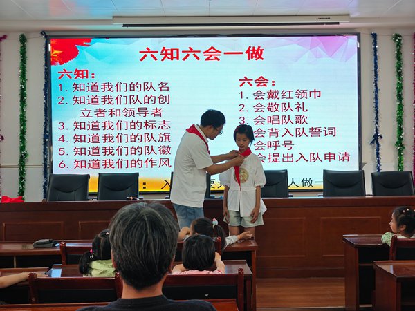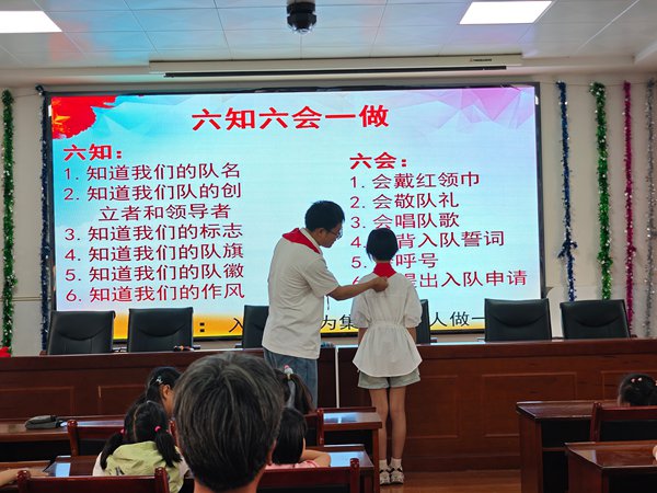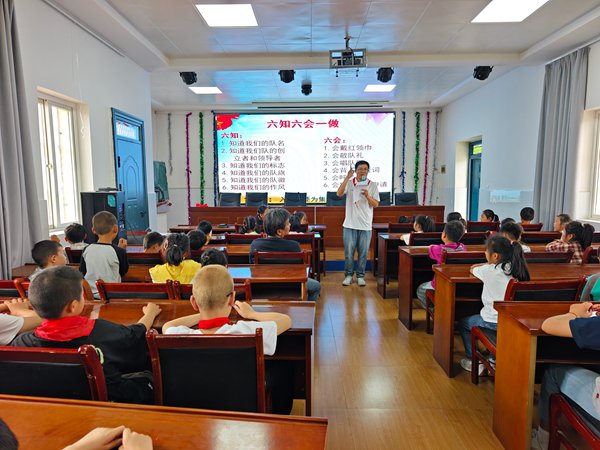 为增强少先队员的光荣感和使命感,5月14日,定远县藕塘小学组织开展了少先队入队前主题教育活动。活动中,大队辅导员通过生动讲解“六知六会一做”具体要求,帮助预备队员深入理解少先队知识。“六知”包括知晓队名、标志、队旗、队徽、创立者及作风;“六会”涵盖佩戴红领巾、敬队礼、唱队歌等实践技能。辅导员结合全国少工委发布的视频教程,现场示范红领巾的正确佩戴方法,并带领少先队员练习队礼、学唱队歌,确保人人掌握入队规范。