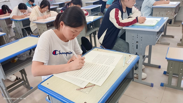 ~ 活动伊始,英语组长陈启广介绍了书写比赛的相关要求。他指出英文书写不仅是语言的载体,更是美学与创意的表达,书写要求卷面整洁、字体工整美观,大家应以严谨的态度,规范书写,展现出个人的巧妙构思和独特风格。随后,同学们信心满满走进赛场,专心致志地投入到比赛中,大家凝心聚力,认真书写一词一句,圆润的字母弧度、飘逸的连笔线条、灵动的排版设计,令人赏心悦目,充分展现了同学们扎实的书法功底。每一份优秀的作品都凝聚着同学们的努力和汗水,也体现了他们对英语学习的执着与热爱