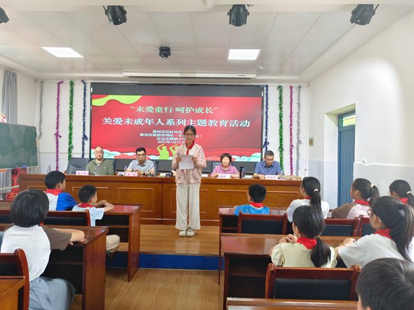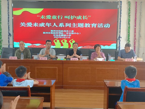 ~ 活动当天,滁州市民政局关工委主任吕永红等嘉宾出席。校长罗培齐致辞欢迎各界支持,学生代表表达感激之情。现场向部分困境儿童捐赠书包等学习用品,并组织全体人员合影留念。随后,通过《未成年人保护法》宣讲、青少年心理健康教育及爱国主义课堂,帮助学生提升法律意识和家国情怀。活动还发放普法宣传手册,进一步强化未成年人自我保护意识。