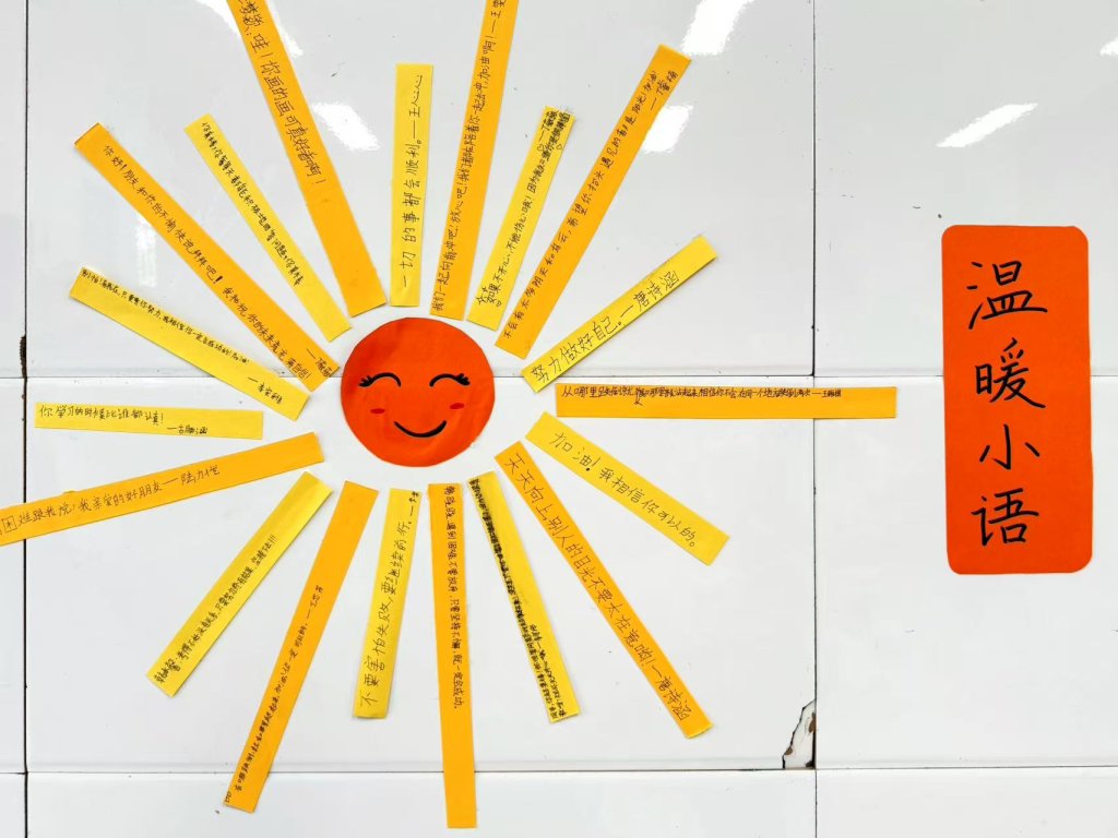 ~ 活动现场,各班精心布置了展示区,以红色太阳为中心,放射状张贴着写满鼓励话语的黄色纸条 ,构成了充满活力与温暖的“温暖小语”墙。
