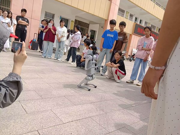 活动现场,科技大棚车展示了一系列涵盖光学、力学、电磁学等领域的科普展品。工作人员还带来了“机器狗表演秀”,灵活的机器狗被同学们围得水泄不通,现场气氛热烈非凡。