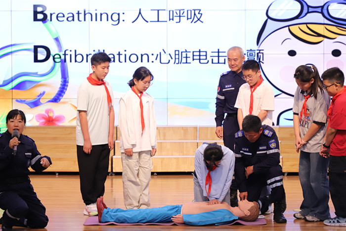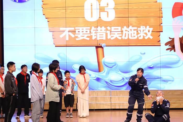 ~ 救援队副队长朱修利强调溺水时保持冷静是关键!接着他通过列举案例、摆事实等方式,用浅显易懂的语言向师生们详细讲解了游泳注意事项,并对不慎落水、溺呛水如何自救进行科学讲解,朱队长还现场演示了心肺复苏、海姆立克急救法,指导学生体验溺水急救的过程,并在现场邀请学生进行体验互动,学生们在体验中明白怎样正确救援,真真切切地学懂、看懂、弄懂。