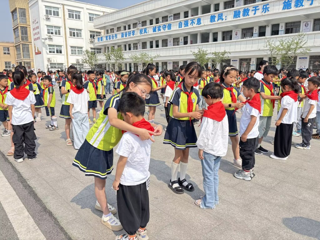 ~ 大队辅导员李月老师宣读了本次入队的一年级新队员名单,新队员们个个站得挺直,昂首挺胸,在鲜艳的国旗和队旗的见证下,老队员们为新队员佩戴上了人生中第一条红领巾,少先队员稚嫩的小手举过头顶,庄严地献上自己的第一个队礼。