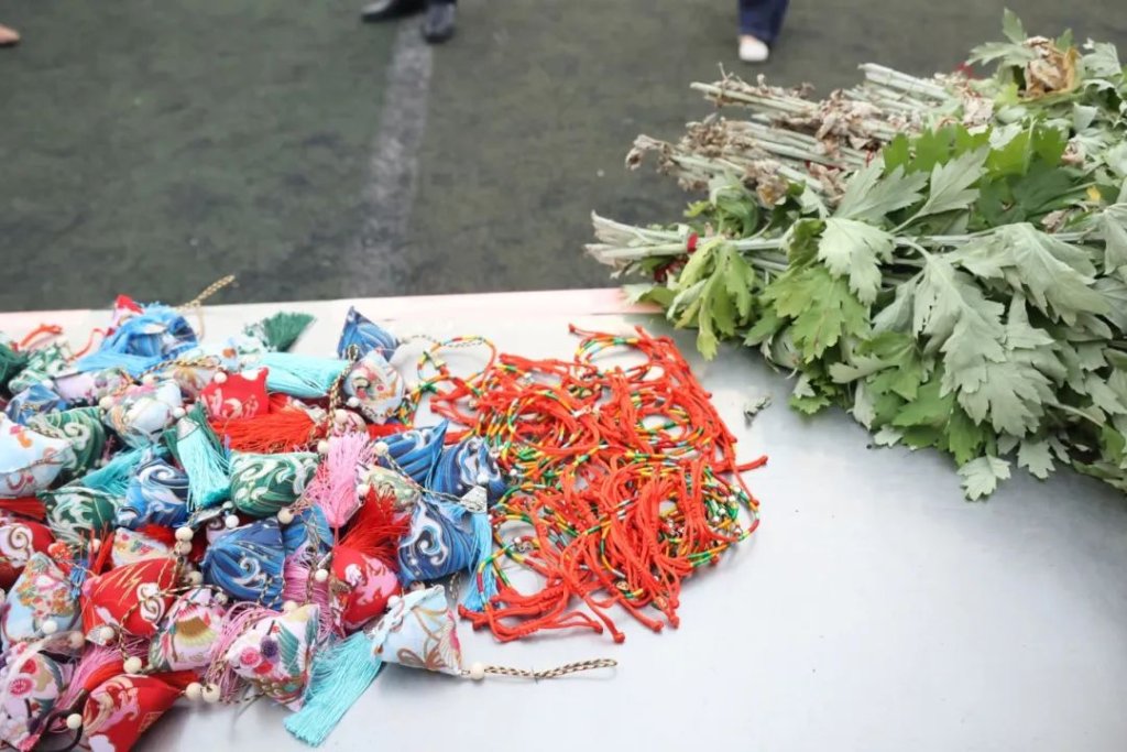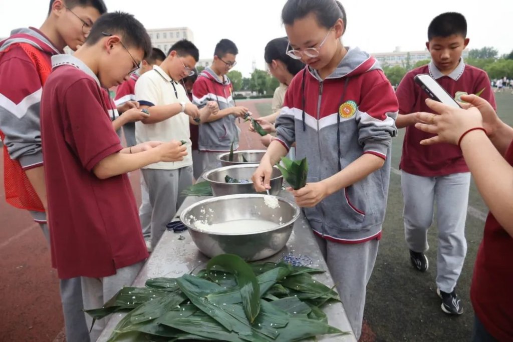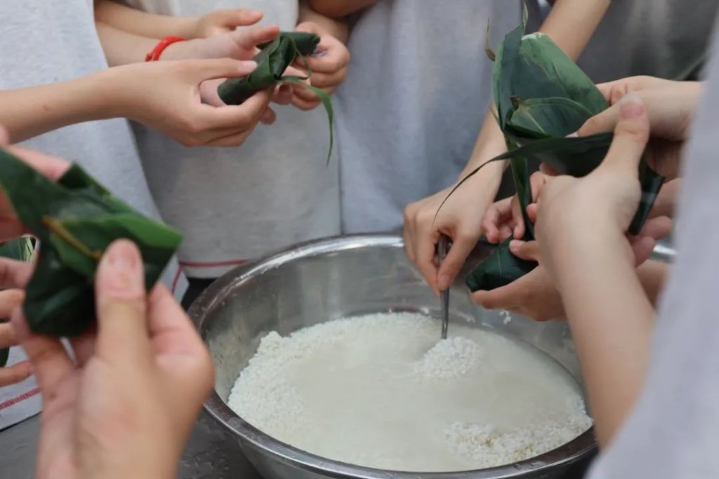 ~ 活动现场,糯米、粽叶、蜜枣等食材整齐地摆放着,同学们在老师的指导下,兴致勃勃地学习包粽子的技巧。他们拿起粽叶,折成漏斗状,填入糯米、蜜枣等各种馅料,再用绳子捆绑扎实,一个个形态各异的粽子在同学们的手中诞生。包粽子的同时,老师还向同学们讲解了端午节的历史渊源、文化内涵和传统习俗,让他们更加深入地了解端午节的重要意义。