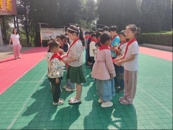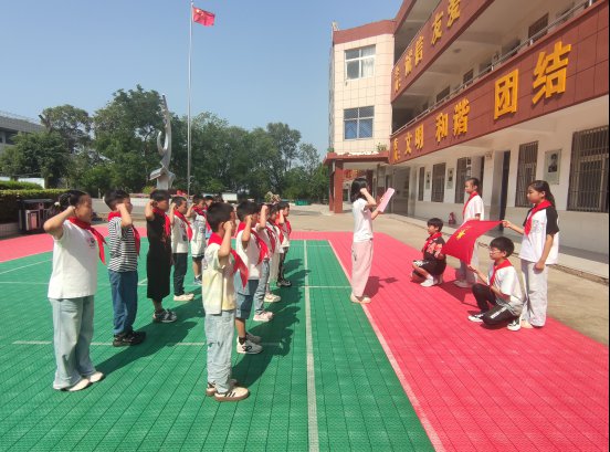 ~ 大队辅导员宣读了新队员入队名单,当听到自己的名字时,新队员们脸上洋溢着激动与自豪的笑容。接着,老队员们手捧鲜艳的红领巾,郑重地为新队员佩戴。红领巾在新队员的胸前飘扬,这不仅是一份荣誉的象征,更意味着一份责任与担当的传递。新老队员互敬队礼,这一刻,标志着新队员正式成为了少先队大家庭的一员。