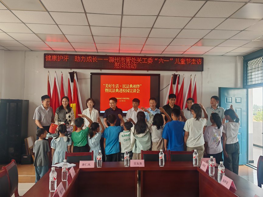 ~ 为深入贯彻落实未成年人保护工作,助力青少年健康成长,5月29日,滁州市市管处关工委党组成员、副主任马健一行走进定远县红山学校,开展“法治进校园”爱心捐赠暨民法典宣传活动,同行的还有定远县教体局关工委主任唐仁凤等。