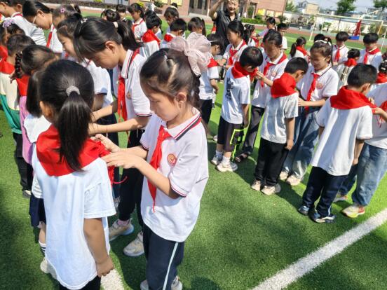 ~ 伴随着音乐,四年级的老队员们为新队员郑重地佩戴上鲜艳的红领巾。新队员们的脸上洋溢着自豪与喜悦,小小的红领巾在胸前飘扬,映照着他们朝气蓬勃的脸庞。