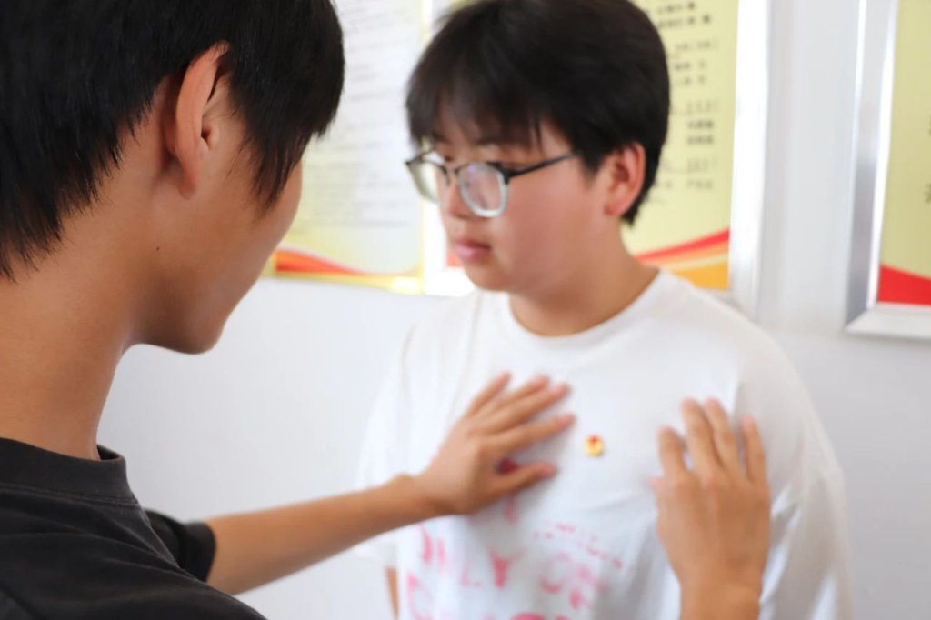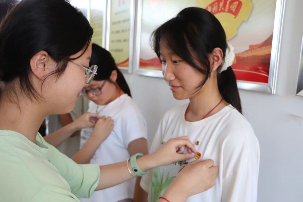 ~ 活动现场,老团员为新团员佩戴团徽。闪闪发光的团徽不仅是一份荣誉,更是一份责任。凌治德书记在总结讲话中指出:”希望新团员们珍惜这份荣誉,在学习和生活中发挥模范带头作用,让青春在奉献中出彩。”