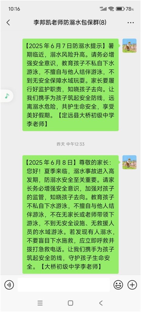 ~ 包保教师通过家长群发送防溺水温馨提示,内容涵盖“六不两会”准则、危险水域预警及家庭监管要点,以通俗话语提醒家长强化暑期监护责任。提示中特别强调“放学后、周末及节假日”等关键时段的看护,让安全提醒直达每个家庭。