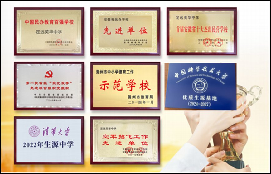 学校办学荣誉辉煌。滁州市定远英华学校坚持落实“立德树人”根本任务,为党育人,为国育才。办学来荣获中国民办教育百强学校、安徽省民办教育先进单位等40余项荣誉称号。近年来,先后收到清华大学、复旦大学、中国科学技术大学、上海交通大学、西安交通大学、哈尔滨工业大学、北京邮电大学、北京师范大学、西北工业大学、吉林大学、大连理工大学、东北大学、兰州大学、海南大学、南京农业大学、四川林业大学等许多高校发来贺信或感谢信。2022年,定远英华中学被清华大学授予“2022年生源中学”称号,2024年,滁州市定远英华中学被中国科学技术大学授予“优质生源基地”称号。