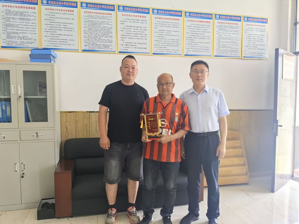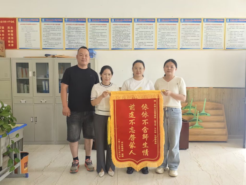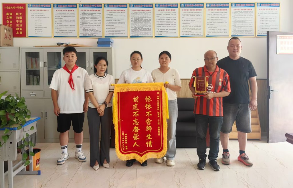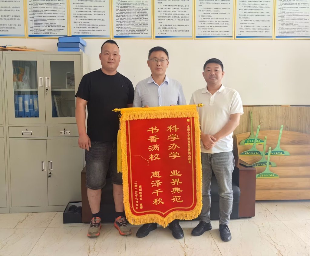 ~ 六月的定远县永康小学,阳光温煦,绿意葱茏,温情与感恩在微风中静静流淌。6月11日下午,六(1)班陈朗乾同学的家长手持三面镌刻着真挚谢意的锦旗走进校园,专程向黄海山校长及班主任和任课教师送上锦旗,致谢学校和老师们的悉心培育与关怀守护。锦旗上“依依不舍师生情 前途不忘启蒙人 ”“科学办学 业界典范 书香满校 惠泽千秋 ”等烫金大字在阳光下熠熠生辉,短短字句承载着家长对黄校长和学校教育工作的高度认可,更饱含着对班主任和全体教师辛勤付出的诚挚谢意。