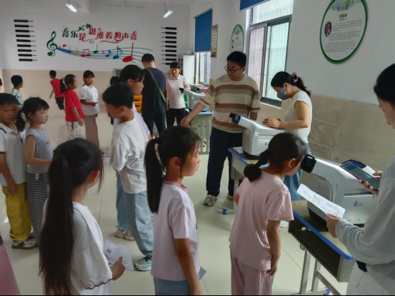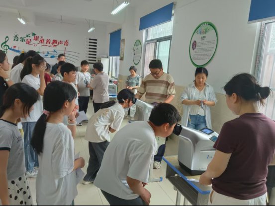 ~ 活动现场井然有序,医务人员借助专业智能的视力筛查设备,严格执行规范操作流程,认真细致地为每位学生进行检查,学生们在老师的组织下积极配合、有序候检。