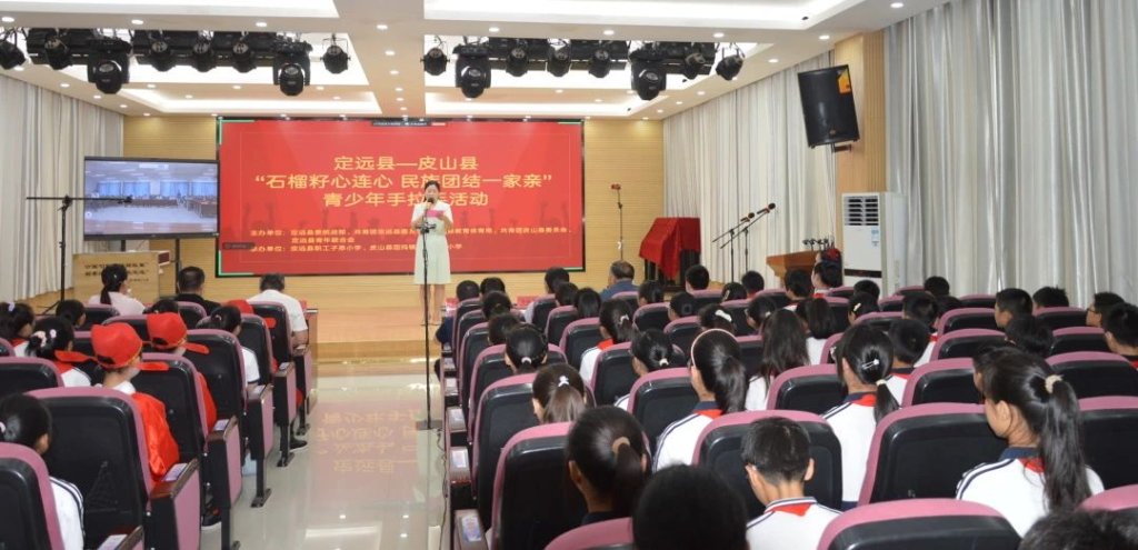 ~ “五十六个星座五十六枝花,五十六族兄弟姐妹是一家。”为认真贯彻落实习近平总书记关于加强和改进民族工作的重要思想和致中国少年先锋队第九次全国代表大会的重要贺信精神,深化青少年民族团结教育,促进各族青少年交往交流交融,由定远县委统战部、定远县教育体育局、共青团定远县委员会、共青团皮山县委员会、定远县青年联合会主办,定远县职工子弟小学、皮山县固玛镇第一中心小学承办的“石榴籽心连心 民族团结一家亲”青少年手拉手结对活动于6月13日下午举办。活动通过定远县职工子弟小学、皮山县固玛镇第一中心小学两个会场现场连线的方式温情开启。定远县委统战部副部长、民族宗教局局长石敏,定远县委教体工委副书记黄如勇,团定远县委书记武赟,团定远县委副书记、县青联主席杨婉莹,定远县委统战部四级主任科员崔耀,定远县少先队总辅导员雍敏,定远县职工子弟小学党支部书记杨孝前出席活动。活动由定远县职工子弟小学少先队大队辅导员王琴主持。
