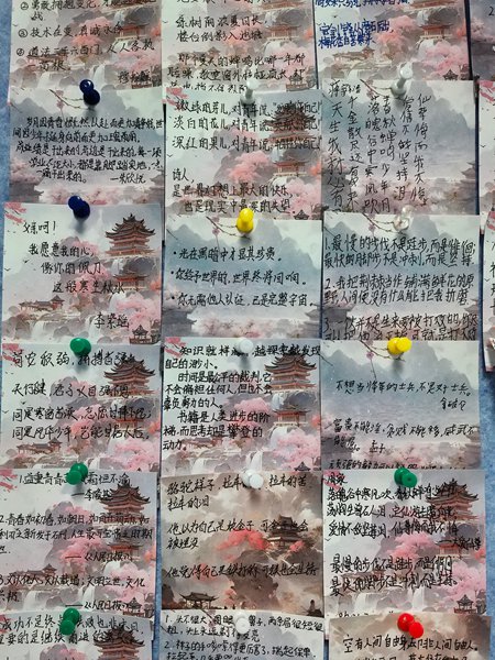 ~ 教室墙壁化作“文学长廊”,学生精选《朝花夕拾》《海底两万里》等名著中的经典语句,以书法、绘画、手抄报等形式呈现。一句“满地都是六便士,他却抬头看见了月亮”(毛姆《月亮与六便士》)引发学生对理想与现实的思考;一幅《平凡的世界》插画配文“生活不能等待别人来安排”,成为激励班级的座右铭。